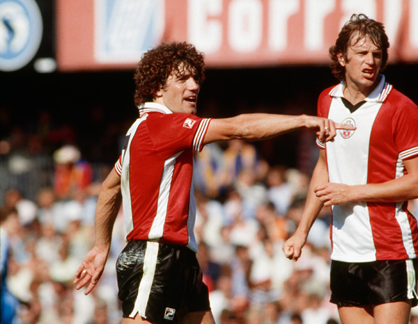 こちらが当時のユニフォーム。この頃サウサンプトンには2人のレジェンドが在籍していた。1970年代、80年代のイングランドを代表するケヴィン・キーガン(左)と、現時点でのクラブ通算最多得点者であるミック・シャノン(右)だ。