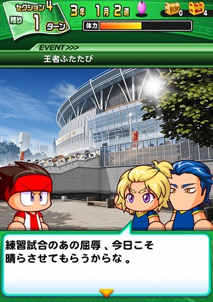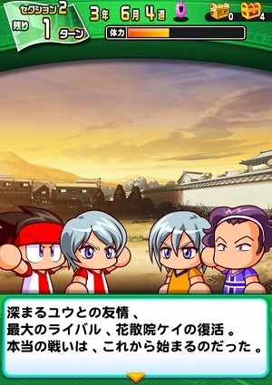 さて、デッキを編成したらサクセスを開始です。サクセスとは主人公のパワサカくんになりきって、高校サッカーライフを追体験しながらキャラを育成するストーリーモードのこと。