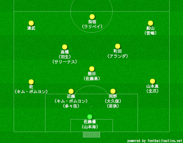 ウイングは右が船山貴之、左が清武功暉で、センターフォワードは指宿洋史とホアキン・ラリベイが争う。