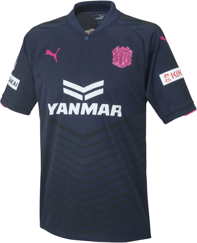 セレッソ大阪は、紺を基調にしたデザインを採用。ピンク一色のエンブレムはかなり強烈だ。