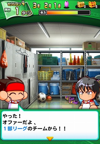 プルルルル。スカウトから連絡があり、1部リーグからのオファーを獲得!スカウトがいる練習メニューを意識的に選んだかいがありました。今度こそ、Aランク突破の手応えあり!