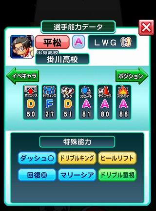 基本能力「オフェンス」の火力が今ひとつでしたが、「スピード」と「テクニック」の数値はまずまず。特殊能力では、平松のオリジナル金特「ヒールリフト」もついて、納得の育成結果となりました。