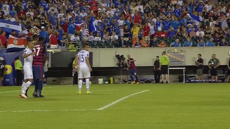 マイケル・ブラッドリーがボールを入れようとするも、ペナルティエリアの中でFWジョジー・アルティドールとDFヘンリー・ロメロが激しくやり合い、レフェリーが一度プレーを止めたのだ。