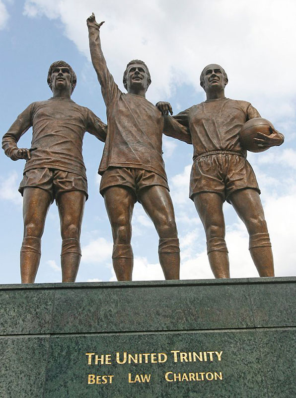 グラフィックプリントされた、オールド・トラッフォード敷地内に設置されているブロンズ像。サー・ボビー・チャールトン、デニス・ロー、ジョージ・ベストの3人が揃った試合は、抜群の破壊力を誇った。