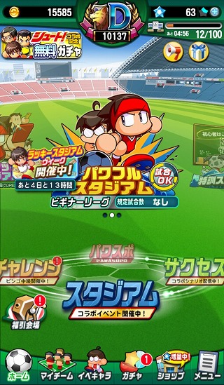 こうして高ランク選手を揃えた編集部Nの次なる野望は・・・そうです!スタジアムへの挑戦です!!スタジアムとは育成した選手でマイチームを組み、全国のユーザーさんと対戦する『パワサカ』のもうひとつの醍醐味です。