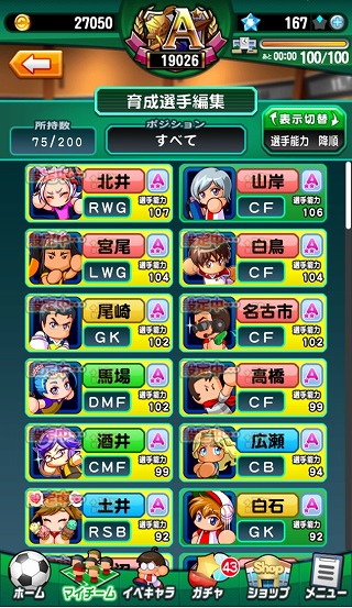 前回、念願のAランク選手を育成して以来、このゲームのコツらしきものをつかんだ気がします。イベントの表示を短くするショートカット機能を使って、サクサクと選手を育成し続けた結果・・・育成選手ボックスがあふれかえっとる(笑)。