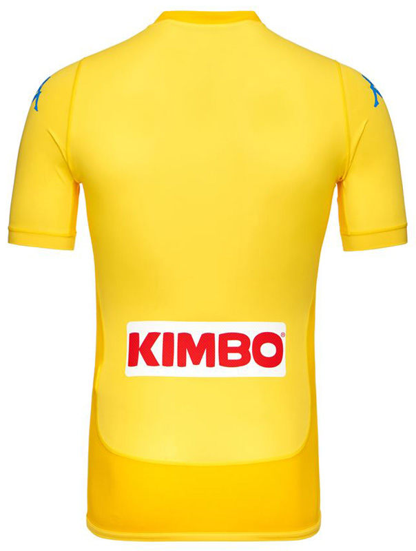 裾部分を色違いでアクセントをつけている点が、これまでのユニフォームとは異なる。背面のスポンサー「KIMBO」はナポリのコーヒーブランドで、日本国内でも入手可能だ。
