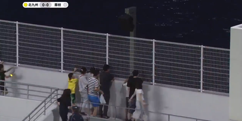 あろうことか試合中にピッチに背を向けるファンがいるなんて…。それでも、これはミクニワールドスタジアム北九州でしか見られない光景だ。