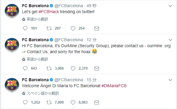こちらは日本時間の23日午前11時7分、突然、PSGのアンヘル・ディ・マリア加入を発表したバルセロナのTwitter。続けて、「ハイ、バルセロナ。OurMineです。私たちにご連絡ください、デマをすみません笑」と投稿された。