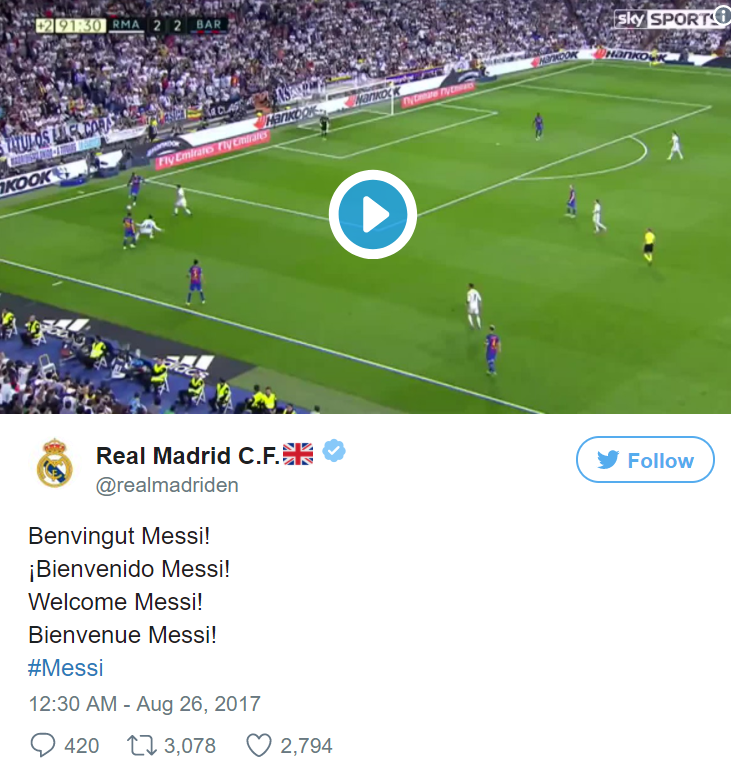 そんななか、レアル・マドリーの公式Twitterが「Welcome Messi!」などとツイートし、メッシの獲得を発表するという驚きの出来事があったようだ。