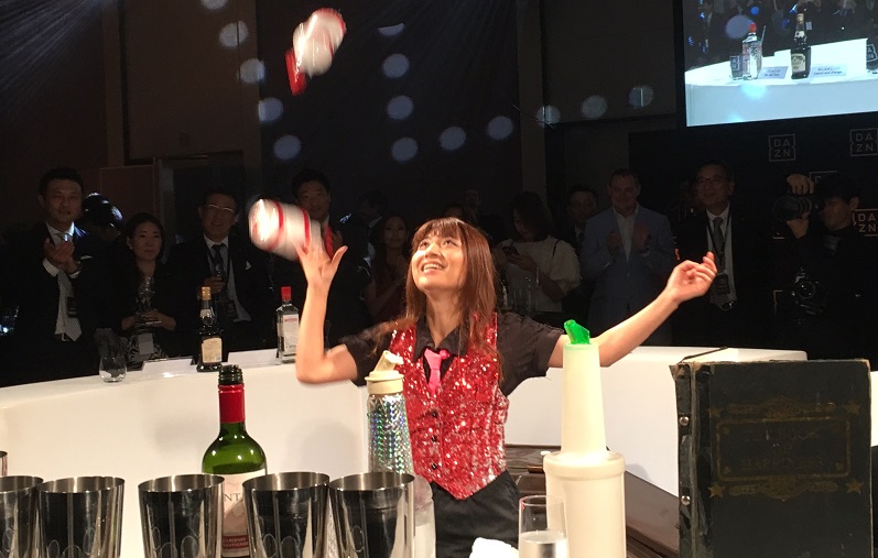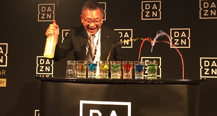 パーティーの中盤にはちょっとしたジャグリングのショーがあり、最後は観客が飛び入り参加でマジックに挑戦。何と指名されたのはJリーグの村井満チェアマン!!これを何なく決め、『DAZN』とJリーグの絆を感じさせる一幕だった。