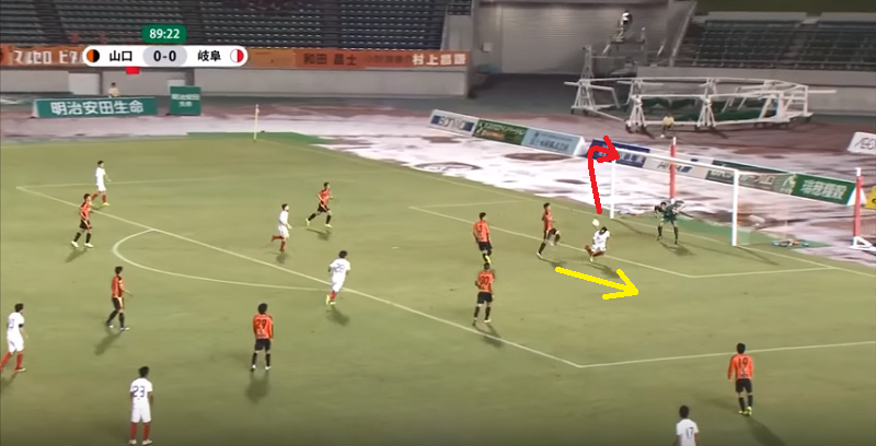 0-0で迎えた90分、小野悠斗が右サイドからクロスを送ると、難波はニアサイドに向かって斜め方向に走り込む。