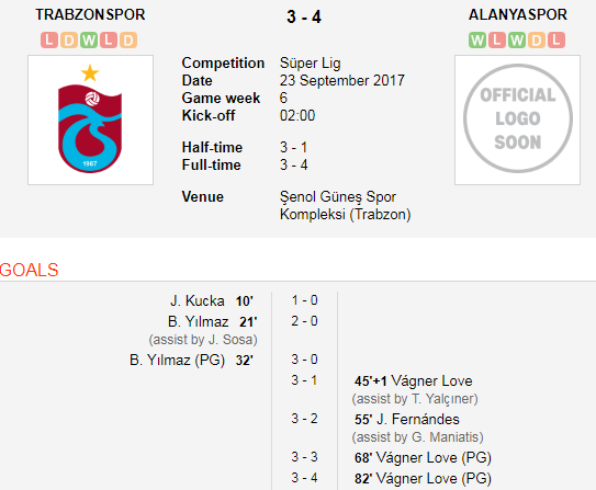 3-0とリードしていたトラブゾンスポルだったが、元ブラジル代表FWヴァグネル・ラヴにハットトリックを喫するなど4失点。なんと、3-4での大逆転負けを喫してしまったのだ。