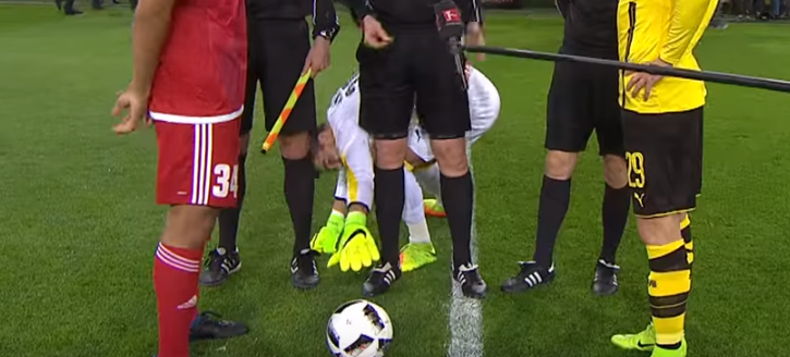 試合のキックオフ直前に両チームのキャプテンと審判団が集まり、コイントスを行う場面。その際、ビュルキは必ずボールに触れるのだ。