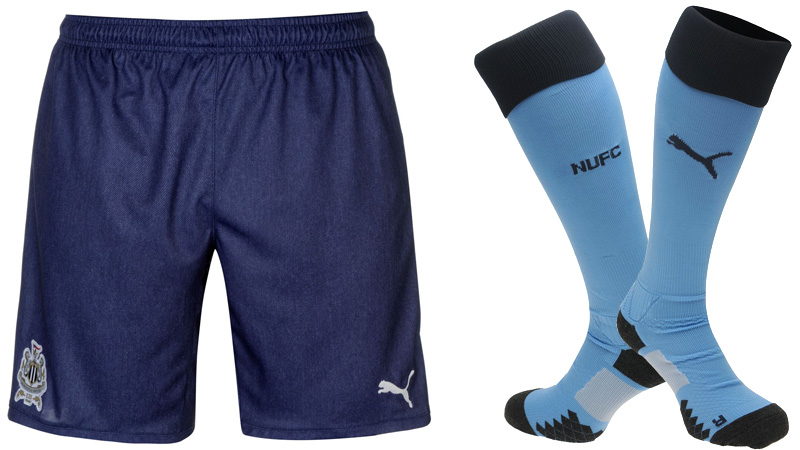 新しいアウェイキットは2013-14シーズン以来となるブルーが基調。1890年代から使われている色で、ニューカッスルのユニフォームには定期的に採用されている。肩のラインはハーフトーンのグラフィックで表現。