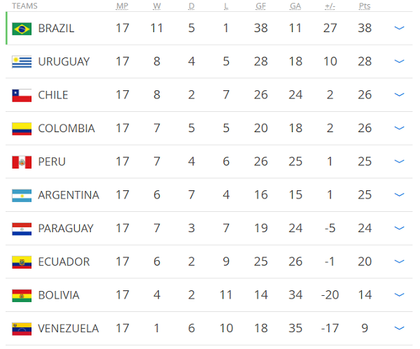 3位コロンビアが敗れたことで、6位だったチリが一気に3位まで浮上!チリは最終節でアウェイでのブラジル戦を控えているだけに大きな白星となった。