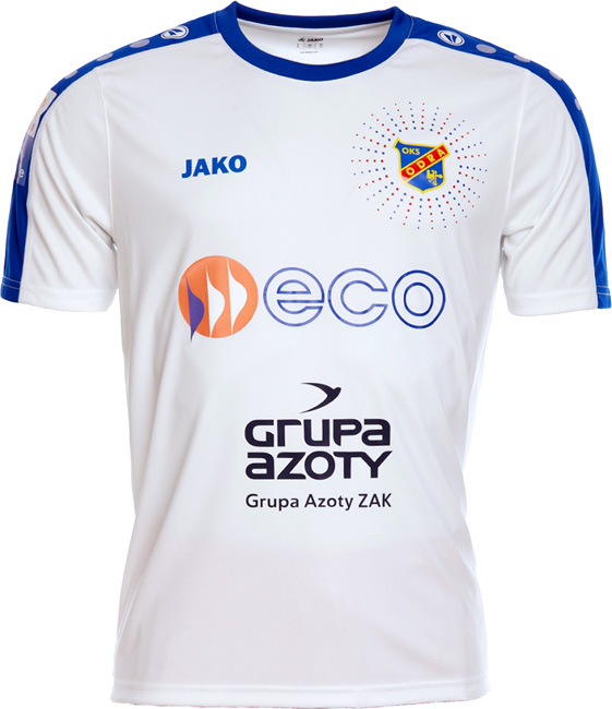 アウェイはホワイトを基調に、差し色にはチームカラーのブルーを配した。胸のスポンサーは2社で、“ECO”はオポレにある火力発電所。“Grupa Azoty”(グルパ・アゾティ)はポーランドの大手化学製品会社。