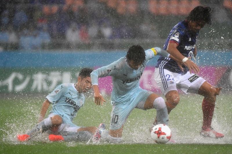 選手やボールが動けば水しぶきが飛び散り、雨粒も写真で確認できるほどだ。試合中にはしきりにボールが止まるシーンも見受けられた。