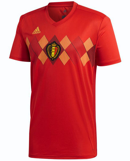 背面の首元にはベルギー国旗色でアーガイル柄をプリント。シャツと同系色のスリーストライプスは脇部分に配している。