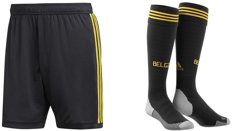 パンツとソックスはともにブラックを基調に、イエローの差し色で彩った。ソックスの前面には国名、背面にはadidasロゴ入り。