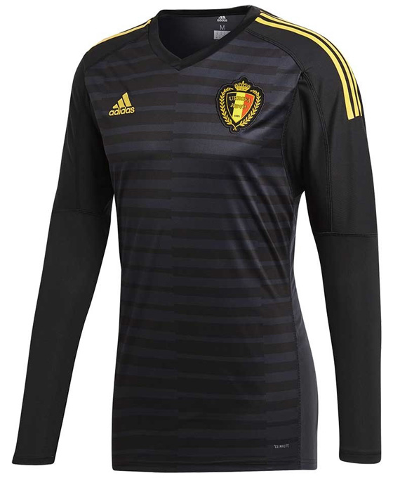 新しいゴールキーパーユニフォームはブラックを基調。ベルギー代表は長袖のレプリカユニフォームをリリースした。不規則なボーダー柄は、adidasの2018GKユニフォームの特徴的なデザインだ。