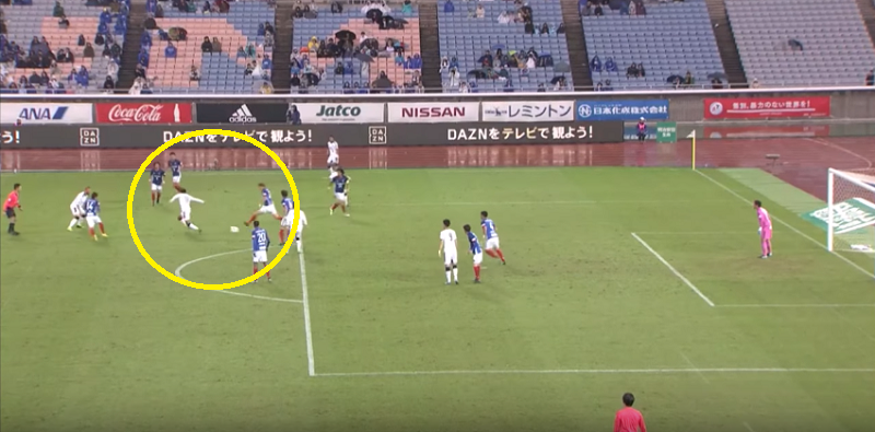 ボールは宙に浮いていたのだが着地と同時にこれをヒールで流し、後方のスペースにパスを通す。すると近くにいた水沼宏太がこれをしっかりと蹴り込み、逆転ゴールとなった。