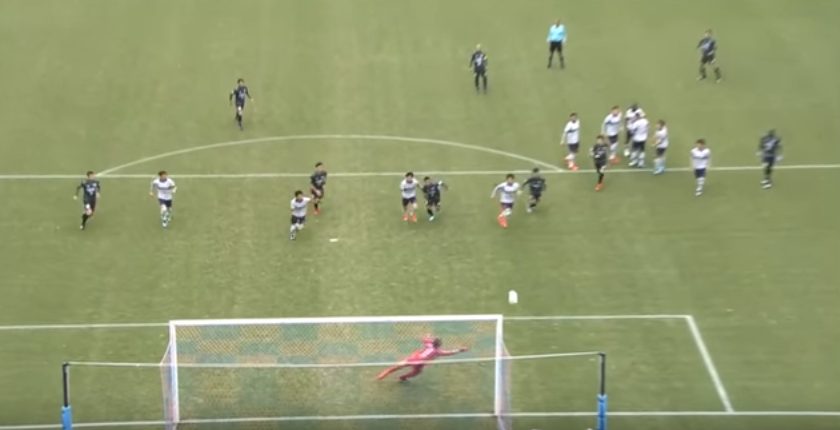 最終的にはポストを直撃しゴールに吸い込まれるのだが、軌道だけを見ると枠を外れそう…それほどぎりぎりのコースだったのだ。