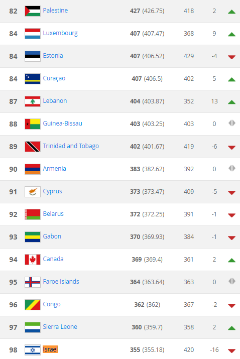 2つ順位を上げたパレスチナ代表は82位。一方、16も順位を下げてしまったイスラエル代表は98位。この結果、両チームの順位が逆転したのだ。