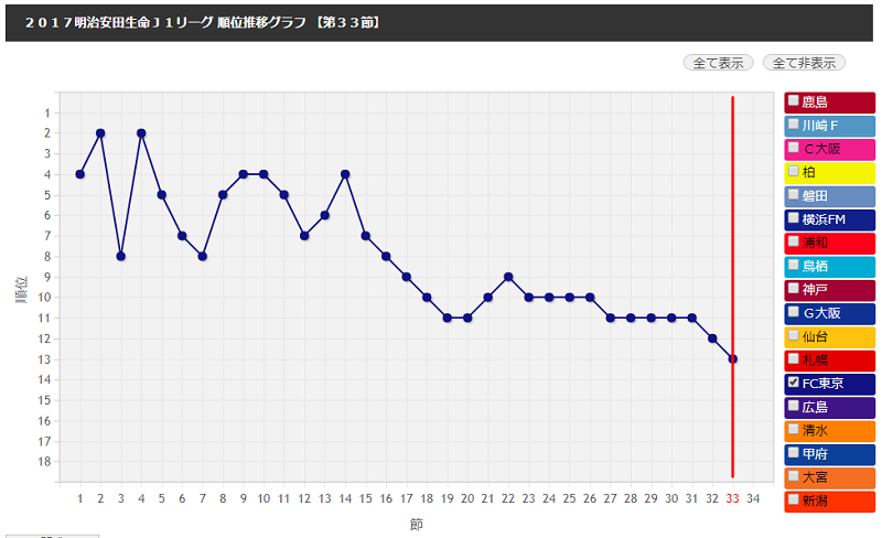 すでに14位につけているサンフレッチェ広島との勝点差が「6」あることから、FC東京が13位より下の順位で終わることはない。