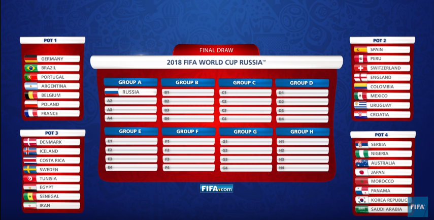 それによれば抽選はポット1から順に行われるとのこと。まずはポット1に入っている7チームの中から抽選が行われ、グループBから順にグループC、グループDといった具合で振り分けられていく(ロシアはグループAに入ることが決定している)。