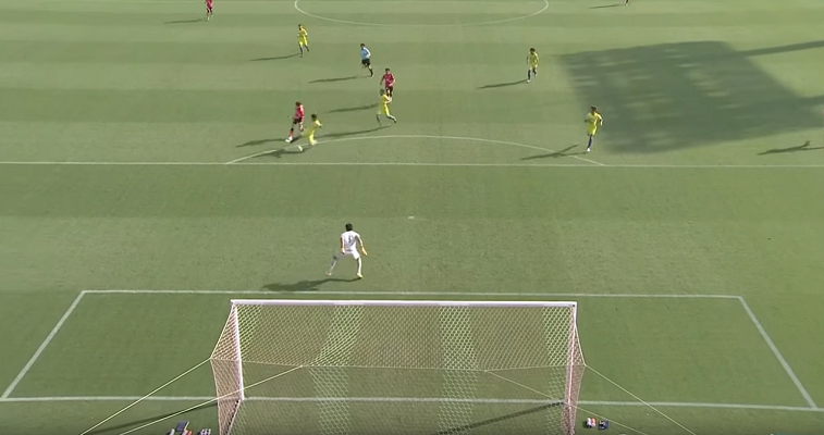 そして、その“遅れ”を活かす形で杉本選手は「股抜きシュート」を狙い、ボールは水本選手の股を抜けて…というのがゴールまでの過程でした。