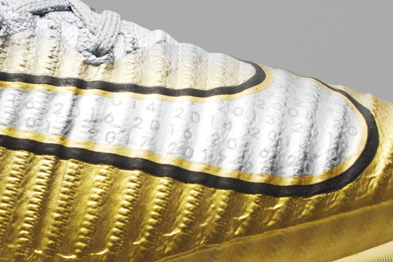 スウッシュロゴの中には、彼がこれまでバロンドールを受賞した年の数字:2008、2013、2014、2016、2017が記されており、足の動きでさらに見えやすくなっている。