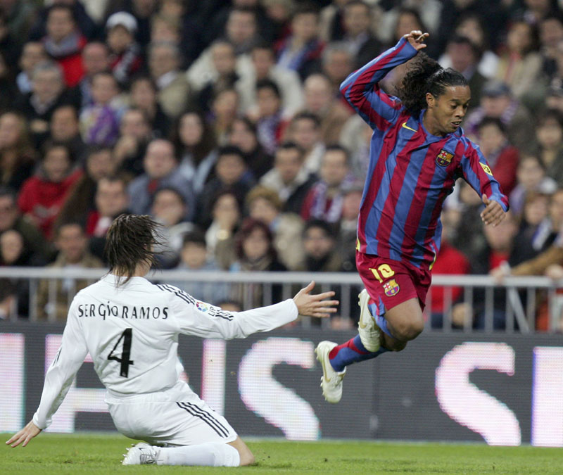 ロナウジーニョの2得点と、サンティアゴ・ベルナベウでの観客のスタンディング・オベーションが記憶に残る試合。このシーズンのバルサのユニフォームは、全体的に明るめのストライプと、硬めの生地が特徴的だった。