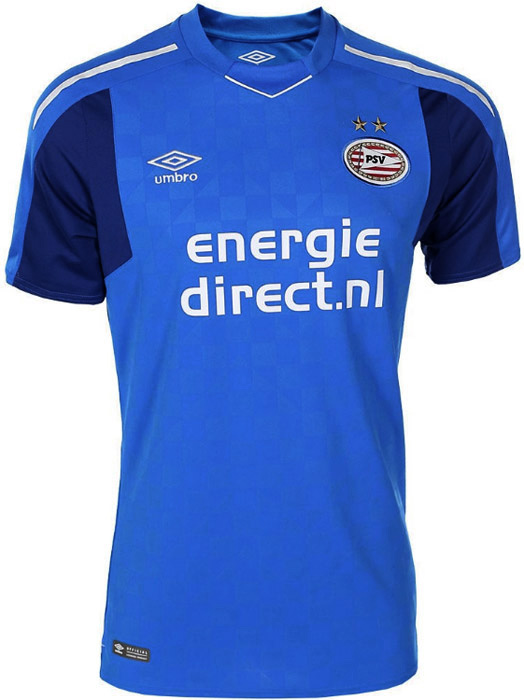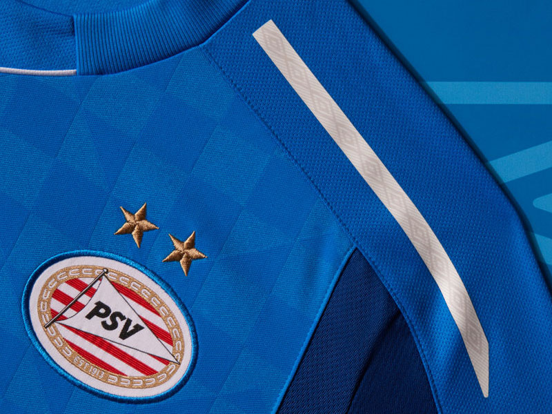 サードユニフォームは定番カラーのブルーを基調に、チェッカーフラッグ柄とダイヤモンドパターンを組み合せたような透かしプリントが入る。袖部分にはダークブルーを配した。