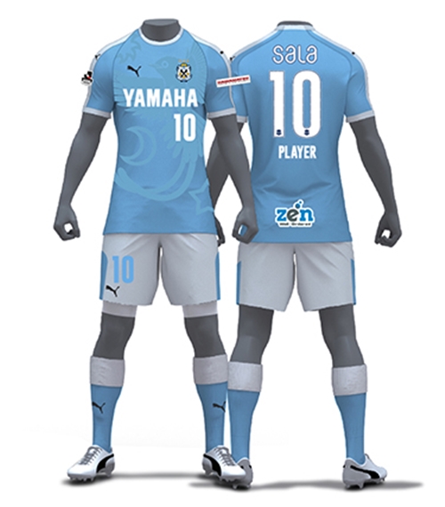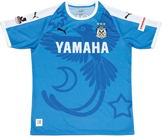 磐田の2018ホーム(1st)ユニフォームは、伝統のサックスブルーを基調に、クラブキャラクターである三光鳥(サンコウチョウ)と、その鳴き声にちなんだ月・日・星のグラフィックを用いたデザイン。