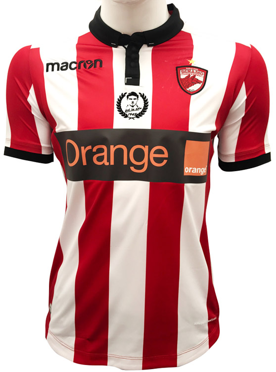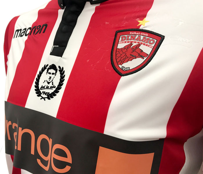 チームの愛称はエンブレムの赤い犬と同じ“Câinii roșii”(The Red Dogs)。胸中央の人物は、2000年に24歳の若さで亡くなったディナモのキャプテン、カタリン・フルダン。試合中にピッチ上で倒れそのまま帰らぬ人となった、悲劇の選手だった。