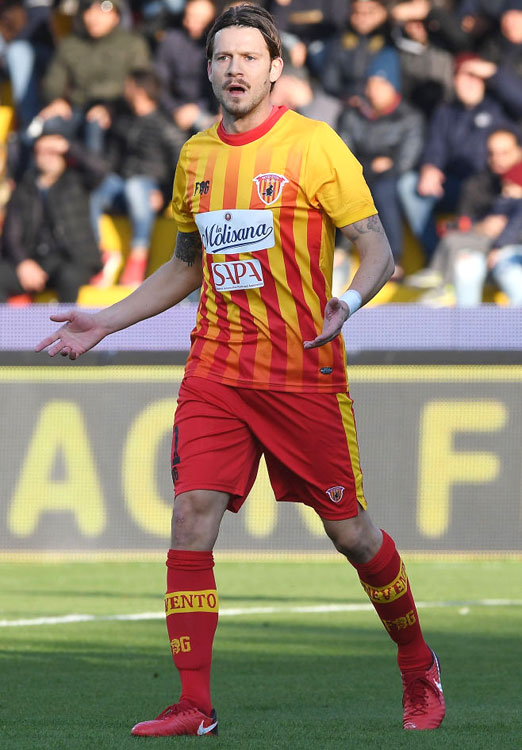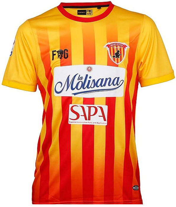 胸には話題の「魔女のエンブレム」。ユニフォームの色(レッド/イエロー)はベネヴェントの旗に見ることが出来る。