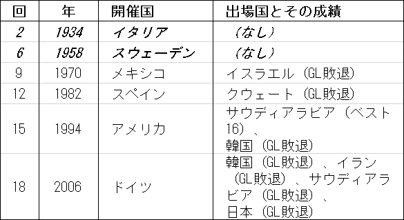 もちろん私は1993年の「ドーハの悲劇」も2006年の「カイザースラウテルンの悪夢」も覚えていますが、他も軒並み振るいません。1934年大会は当時イギリス統治下のパレスティナがエジプトに、1958年大会は独立後のイスラエルがウェールズに敗れて本大会出場を逃しました。そもそも今ではイスラエルはUEFAですし。