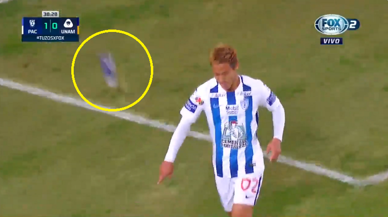 ゴールした直後、本田の目の前を何かが通過している。