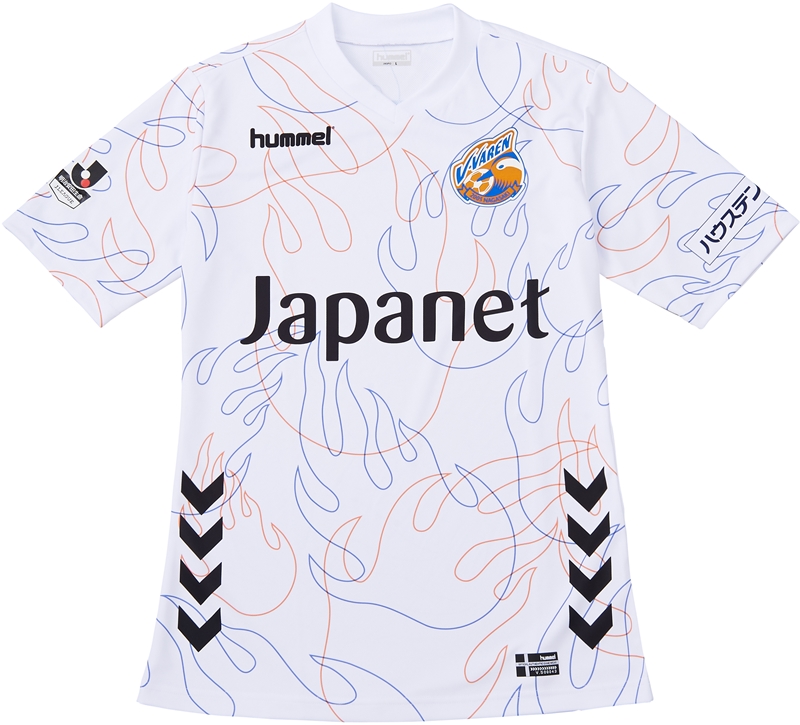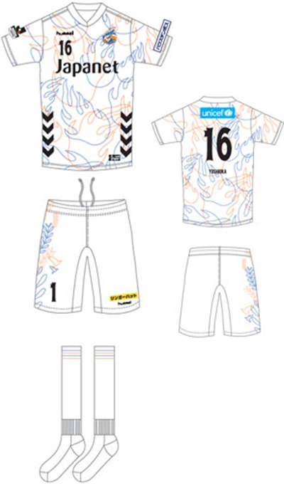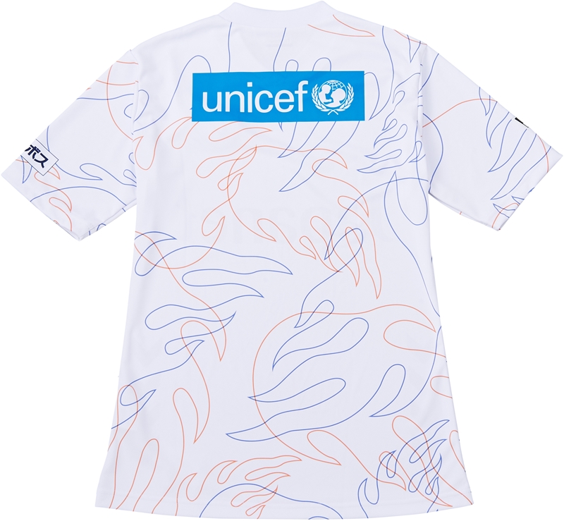 白のアウェイは、「長崎くんち」の龍踊りで見られる炎を配したデザイン。パンツには鳩とオリーブが描かれている。