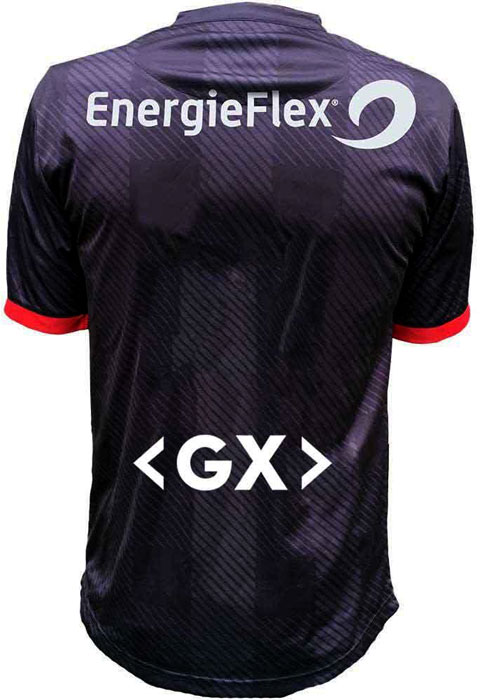 背面の構成は基本的にはホームユニフォームと同じ。胸元や袖口にはレッドの差し色で彩っている。腰部分のスポンサー“GX”はソフトウェア開発会社。