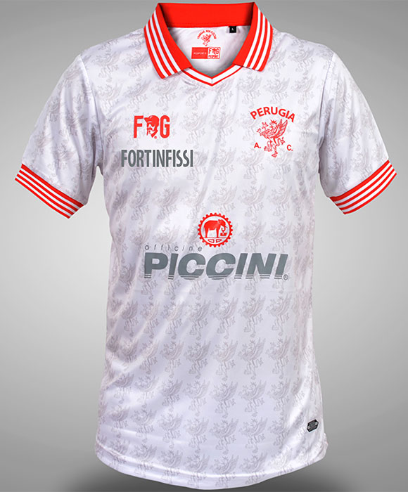 ホワイトのユニフォームもペルージャでは伝統的なカラー。デザインはホームユニフォームと同じの色違いとなっている。右胸にはスポンサー“FORTINFISSI”(建材メーカー)をプリント。