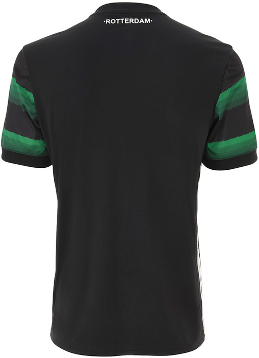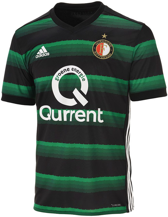 ブラック/グリーンのアウェイユニフォーム。使われている色自体はフェイエノールトでは定番だが、グリーンはグラデーションの水平ストライプがモダンかつ斬新なデザインだ。