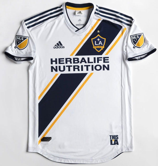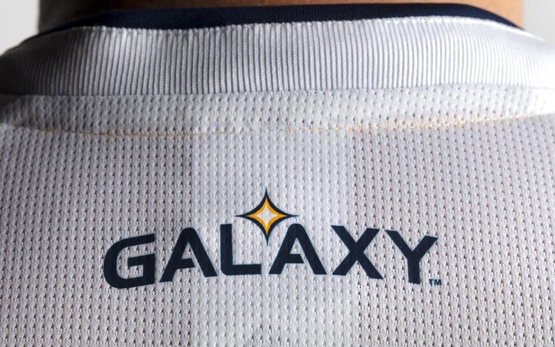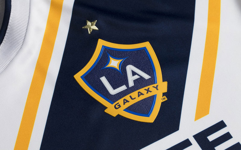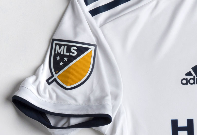 袖のMLSロゴマークはチームごとに色が異なり、LAギャラクシーはチームカラーのネイビー/イエローをプリントしている。
