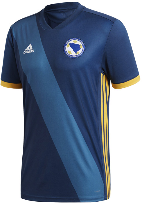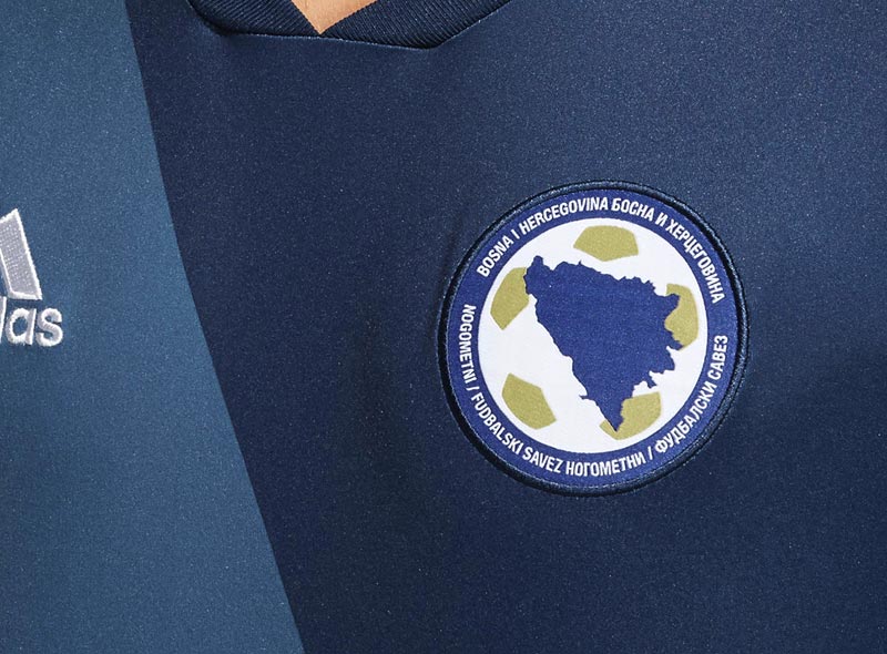 エンブレムは、ボスニア・ヘルツェゴビナの国土をグラフィック化。それを囲む文字「ボスニア・ヘルツェゴビナサッカー連盟」は、ボスニア語とセルビア語の両方で書かれている。