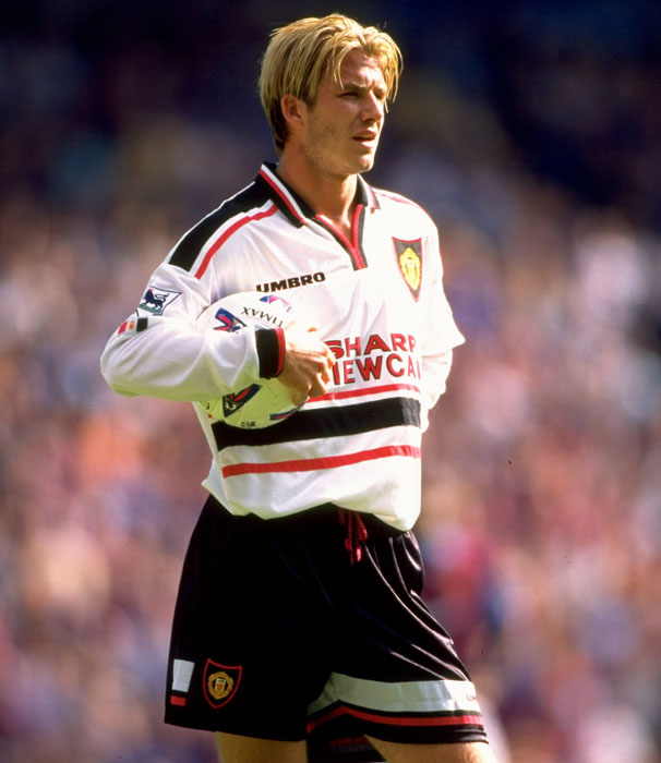 デイヴィッド・ベッカムが着ているこのアウェイキットは、同じホワイトを基調でも96-97モデルとは比べ物にならないほどの存在感があり、人気が高かった。各部に配したレッド/ブラックのラインが印象的。再びエンブレムは盾形スタイルを採用している。