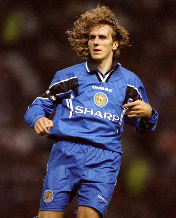 このシーズンはホームキットの印象が強すぎて、このアウェイキットは存在感がちょっと薄かった。デザインはシンプルで斜めのシャドーストライプを施している。ポール・スコールズとともに喜んでいるのは、ジョルディ・クライフ。