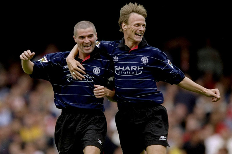 SHARPがスポンサードした18年間で唯一“SHARP digital”ロゴをプリントしたユニフォーム。ユナイテッドでは珍しい水平ピンストライプを採用している。写真は99年8月のアーセナル戦で決勝点をあげたロイ・キーンと、彼を祝福するテディ・シェリンガム。