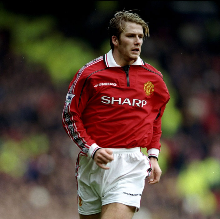 数あるユナイテッドのユニフォームでも1,2を争う高い人気を誇ったのが、ベッカムが着ているこのホームキット。とくに98-99シーズンはプレミアリーグ、FAカップ、そしてチャンピオンズリーグを優勝してトレブル(三冠)の偉業を成し遂げた。シャツの胸元はジッパーで開閉する仕様が特徴的。
