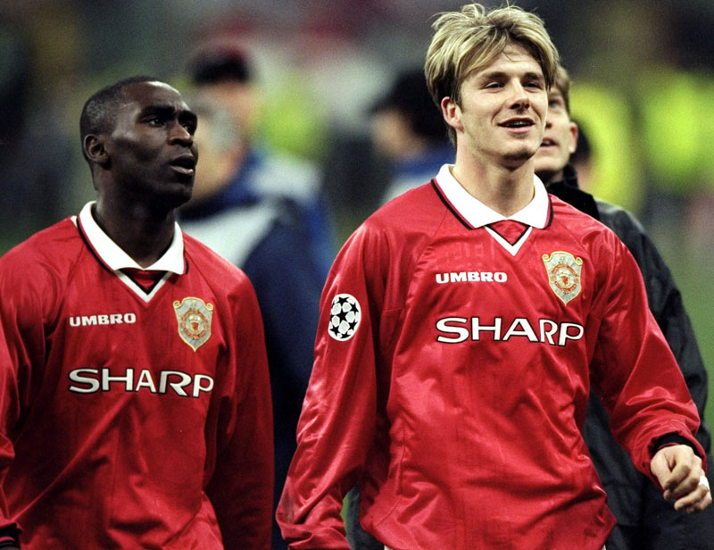 1999年のCL決勝であの「カンプ・ノウの奇跡」を成し遂げたキット。シャツにはCLスターボールの透かしプリントが入っている。シャツのデザインが同じため1997-2000と一括りにされることが多いが、正確には1997-99と1999-2000では異なる。写真左はアンディ・コール。